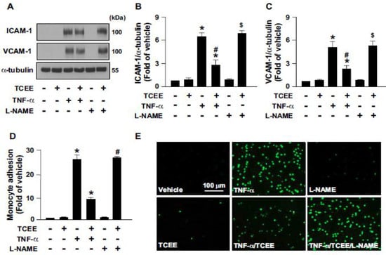 TCEE inhibits the TNFα-induced adhesion of monocytes onto ECs and the protein expression of adhesion molecules in ECs. ECs were pretreated with TNFα (10 ng/mL) or the vehicle for 12 h, followed by treatment with L-NAME (400 μM) for 1 h and/or TCEE (2 μg/mL) for another 18 h. (A–C) Cellular lysates were subjected to Western blot analysis for quantifying the protein expression of ICAM-1, VCAM-1, and α-tubulin. (D,E) BCECF-AM-labeled human monocyte THP-1 cells (1 × 105) were added and incubation with ECs for 1 h. The cellular lysates were subjected to fluorometry and photo-micrographed. Data are mean ± SEM from 5 independent experiments. * p < 0.05 vs. vehicle group; # p < 0.05 vs. TCEE-treated group; $ p < 0.05 vs. TNF-α +TCEE-treated group.