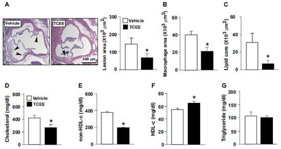 TCEE ameliorates hyperlipidemia and atherosclerosis in ApoE−/− mice. Male ApoE−/− mice at age 16 weeks were orally administered with TCEE (5 mg/kg/day) or vehicle for 4 weeks. (A) Atherosclerotic lesions at aortic roots were stained with H&E. (B) The area of macrophages in the atherosclerotic lesions. (C–G) Serum levels of total cholesterol, non-high-density lipoprotein cholesterol (non-HDL-c), HDL cholesterol (HDL-c), and triglycerides. Data are mean ± SEM from 10 mice. * p < 0.05 vs. vehicle. Scale bar = 300 μm.