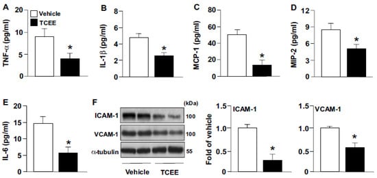 TCEE attenuates systemic and aortic inflammation in ApoE−/− mice. Male ApoE−/− mice at age 16 weeks were orally administered with TCEE (5 mg/kg/day) or vehicle (oil) for 4 weeks. (A–E) ELISA of serum levels of TNF-α, IL-1β, MCP-1, MIP-2 and IL-6. (F) Western blot analysis of protein levels of ICAM-1, VCAM-1, and -α tubulin in aortas from ApoE−/− mice. Data are mean ± SEM from 10 mice. * p < 0.05 vs. vehicle.