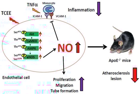 Schematic illustration of the proposed mechanism underlying the TCEE-mediated anti-inflammatory effect in ECs and atherosclerosis. As shown, challenge with TCEE elicits the activation of the Akt/CaMKII/AMPK/eNOS/NO pathway, which in turn promotes pro-angiogenic activity and inhibits the pro-inflammatory response by TNF-α in ECs and retards the atherosclerosis in ApoE−/− mice.