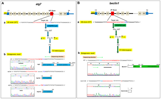 Atg7 and beclin1 mutant lines were generated using CRISPR/Cas9 gene-editing technology in zebrafish. Briefly, the sgRNA targeting sites were chosen in the 10th and 4th exons of atg7 and beclin1, respectively. After microinjection of Cas9 and gRNA mRNAs into 1-cell zebrafish embryos, the growing embryos were termed as F0 generation. The chimera F0 mated with wild-type (WT) zebrafish to obtain the F1 heterozygous generation, from which we obtained F2 by mating heterozygous males and females (Figure 1Aa,Ba). To verify the specificity of atg7 and beclin1 heterozygous target sites, the PCR products obtained from the heterozygous F1 DNA were purified and inserted into the PMD™–18T vector for sequencing. Finally, two atg7 mutant lines with 5-bp deletion (atg7Δ5) and 2-bp deletion (atg7Δ2) were produced, respectively (Figure 1Ab). Zebrafish Atg7 protein consists of two functional domains, including the ATG-N superfamily and E1 enzyme superfamily, and the deletions in the Atg7Δ5 and Atg7Δ2 resulted in a frame-shift caused by a premature stop codon. On the other side, one beclin1 mutant line was established, which contained 8-bp deletion, named beclin1Δ8 (Figure 1Bb). Beclin1 protein consists of two functional domains, including BH3 and APG6 superfamily, and the deletions in Beclin1Δ8 resulted in a frame-shift caused by a premature stop codon in the mutant line.