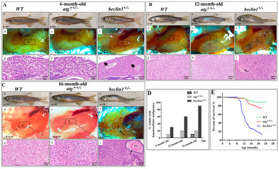 WT and both reared heterozygous strains from F2 generation grew normally and did not manifest any distinct phenotype before 6-month-old, whereas the homozygous mutants of atg7 and beclin1 died at the larval stage. On dissection, the liver appeared normal, while histological observation showed the beginning of alternation in the hepatic parenchyma accompanied by a little proliferation and bile sequestration in some beclin1+/− males (Figure 2Aa–i). At 12-month-old, beclin1 heterozygous exhibited curved bodies with enlarged belly and the liver covered most of the abdominal cavity where small white ulcers developed on its dorsal side (Figure 2Ba–f). Histological analysis revealed abnormal hepatocyte proliferation that appeared in irregular cords in the beclin1+/− fish, unlike the WT and atg7+/− individuals (Figure 2Bg–i). At 16-months-old, beclin1+/− males became feebler with exhausted energy and obvious hepatic tumors, hemorrhagic, and inflammatory appearance (Figure 2Ca–f). Hepatic tissue of beclin1+/− exhibited heavily cellular condensation with pyknosis and mature focal necrosis could be observed (Figure 2Cg–i). After macroscopic observations and histological analysis in 6, 12, and 16-month-old beclin1+/− males, we could determine the microscopic tumorigenesis distributed in the liver. At 6-month-old, liver of beclin1+/− exhibited a little increase in cellular proliferation. At 12-month-old, hepatic tissues were modified into diffused cords that increased by 16-month-old with solid necrosis in about 90% of the beclin1+/− zebrafish (Figure 2D). Almost no mortality occurred before 6-month-old in the beclin1+/− zebrafish, whereas 40% and 75% of beclin1+/− males died at 12 and 16-month-old, respectively. On the other side, WT and atg7+/− males did not exhibit changes during the developing time, and little mortality has been recorded (Figure 2E).