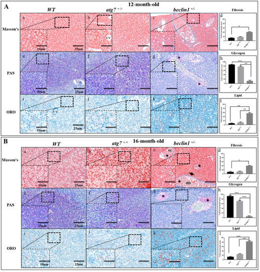 To detect hepatic metabolic equilibrium, liver glycogen was stained with Periodic Acid-Schiff (PAS). Here, hepatocytes of the WT and atg7+/− contained an adequate amount of glycogen at 12-month-old as well as at 16-month-old (Figure 3Ae–g,Be–g), while beclin1+/− hepatocytes showed a severe reduction in the glycogen contents (Figure 3Ag,Bg). Moreover, Oil Red O (ORO) staining showed remarkable hypertrophy of hepatocytes with fatty changes and cloudy swellings in the liver tissue of beclin1+/− compared to WT and atg7+/− (Figure 3Ai–k,Bi–k). A significant decrease in hepatocyte glycogen and increase in hepatocyte lipids were detected and calculated in beclin1+/− compared to WT and atg7+/− zebrafish (Figure 3Ah,Al,Bh,Bl).