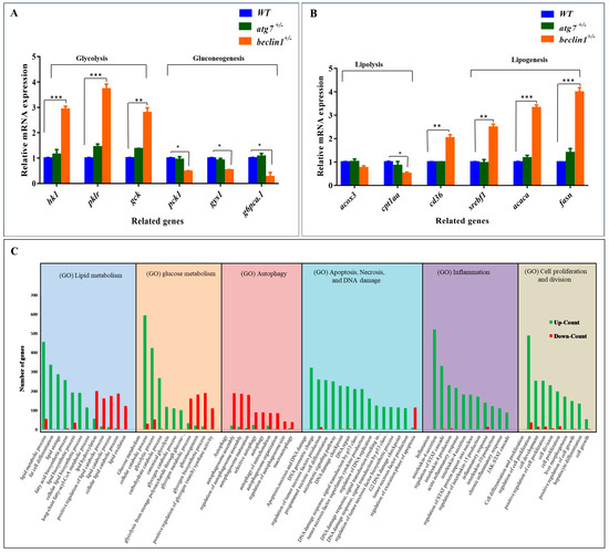 Effects of beclin1 heterozygosity on the hepatic glucose/lipid flux at the genetic level. Expressions of mRNA in 16-month-old zebrafish evaluated by qRT-PCR for glycolysis and gluconeogenesis related genes (A) and lipolysis and lipogenesis related genes (B) indicating the disturbance of glycogen and lipid metabolism. (C) Gene Ontology (GO) analysis of differential expression genes (DEGs) in the liver between beclin1+/− and WT. The y-axis represents the number of genes of the biological processes in the x-axis. The numbers of upregulated DEGs (green bars) and downregulated DEGs (red bars) are shown. Data are expressed as mean ± SD. * p < 0.05, ** p < 0.01, and *** p < 0.001.