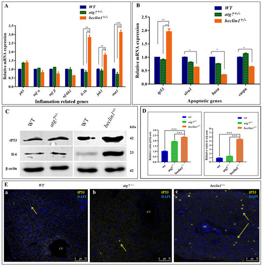 Abnormal apoptosis and inflammation response in beclin1+/− liver. Expressions of mRNA in 16-month-old zebrafish evaluated by qRT-PCR for inflammation-related genes (A) and apoptotic-related genes (B). (C) Representative immunoblots showed the relative protein expression of tP53, IL-6. β-actin was used as the vehicle control. (D) The ratio of tP53/β-actin and IL-6/β-actin evaluated by NIH software Image J. (E) Immunofluorescence of liver tissues probed against mutated tP53. The nuclei of the necrosis hepatocytes indicated the genomic instability and DNA damage in tumor cells (yellow arrows). CV: central vein; NC: Necrosis. Data expressed as mean ± SD. * p < 0.05, ** p < 0.01, and *** p < 0.001.
