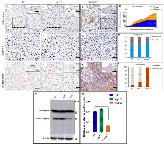 On the histological level, cellular apoptosis was detected by the TUNEL assay. The apoptotic cells (brown cells) were widely distributed in WT and atg7+/− zebrafish (Figure 7A,B,E,F), while they were mainly observed around the necrosis in beclin1+/− zebrafish (Figure 7C,G). All cells have been automatically counted in a fixed area (triplicate counting) that showed highly proliferative activity in the hepatocyte of beclin1+/− zebrafish (Figure 7D). The average percentages of apoptotic cells were obviously decreased in the liver of beclin1+/− zebrafish compared with that of WT or atg7+/− zebrafish (Figure 7H). To define the inflammatory role of the cytokines IL-6, immunohistochemistry of liver tissues revealed an aggressive accumulation of IL-6 protein in beclin1+/− unlike the depletion or almost absence of that protein in WT and atg7+/−, which is an obvious indication of chronic inflammation caused by the heterozygous distribution of beclin1 (Figure 7I–K). In addition, the stained area density of IL-6 showed higher inflammation that covers more than 96% of the liver tissue of beclin1+/− compared to WT or atg7+/− (Figure 7L). Probably, the increased inflammation and uncontrolled proliferation in beclin1+/− liver is because of apoptosis limitation. For further clarification, Western blotting was performed and revealed that the cleaved-caspase3 was downregulated in beclin1+/− livers compared with WT or atg7+/− (Figure 7M,N).