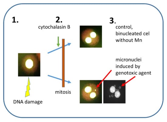 A principle of cytokinesis-block micronucleus assay. 1. Nucleus with damaged DNA. 2. Inhibition of cytokinesis by the addition of cytochalasin B. 3. The Mn frequency is scored in binucleated cells only. Upper part—control binucleated cells without Mn, lower part—two binucleated cells with 1 or 6 Mn visible in the cytoplasm.