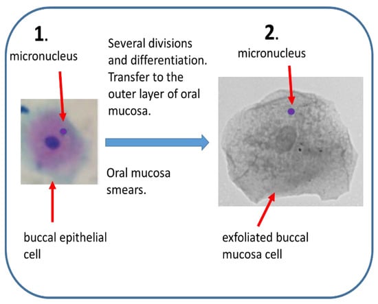 Mn in the buccal cells are formed in the organism, in rapidly dividing buccal epithelial tissue (Figure 3). Although cells from the oral cavity are exposed to genotoxic or cytotoxic factors by inhalation and food intake to a greater extent than peripheral blood lymphocytes, the background frequency of Mn in buccal cells is very low [93,94]. On the other side, patients undergoing head and neck radiotherapy may serve as a positive control, although some ethical issues must be considered, as in their case the collection of material is more problematic due to lesions and inflammation of the oral mucosa [88,95]. The BMm was used to investigate the impact of nutrition, lifestyle factors (as smoking, drinking alcohol or betel chewing), genotoxin and cytotoxin exposure. Interestingly, correlation was found between the frequency of Mn in buccal cells and increased risk of accelerated aging, certain types of cancer and neurodegenerative diseases [92,96].