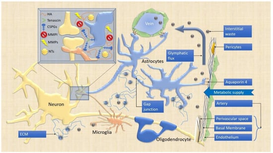 The fourth compartment of the synapse is indeed a non-cellular element [13]. The resilience of CNS and synaptic plasticity in the critical period of development and in the adult brain depends on specialized forms of ECM, such as the interstitial matrix, the perineural nets (PNNs) and the basement membrane. Particularly, this last structure is important for the integration of the neurovascular unit (NVU) to obtain an overall model that could be used as a start point for a systems biology-based approach [14]. The implementation of protein–protein interactions involving all the cellular and non-cellular elements of the system can help the building of hub-spoke network maps [14] to design further experiments with translational purposes. Indeed, the ECM is involved in the bidirectional exchange of nutrients and metabolic products between CNS and systemic circulation. The specialized blood–brain barrier (BBB) is one of the finest exempla of integration among cellular compartments (glia, pericytes, endothelium) and the ECM, that can selectively permit the transmembrane active transport, the diffusion of molecules through tight junctions, and the selective loosening and remodeling of the BBB [15]. The matrix metalloproteinases (MMPs), as well as other proteases and their relative matrix receptors and regulators, can actively participate in the modulation of CNS circuitry response to various stimuli. In addition, they can mediate the immune system activation and the reshaping of the NVU [16]. This complex and emergent system is furthermore pivotal in the so-called glymphatic regulation, a novel physiological model to clear out wastes of the cellular metabolism from the CNS parenchyma through the dynamic exchange between cerebrospinal fluid (CSF) and the ECM via the NVU [17,18].