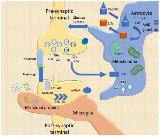 Cellular elements in the synaptic cleft. The schematic representation of a glutamatergic synapse highlights the role of molecular pre-synaptic (neurexins), post-synaptic (neuroligin) proteins and the astrocytic hevin in the stabilization of the cleft structure. The reuptake of neurotransmitters by glutamate transporters (GTs) is mainly provided by astrocytes. Moreover, astrocytes are responsible for the proneurotrophins (proNTs) alternative intracellular processing to active NTs and the metabolic coupling. The synaptic plasticity phenomena are widened by the astrocytic calcium waves, ensured through gap junction and by microglial trogocytosis (the partial engulfment of dendritic spines or axonal portions). The scavenger role of microglia is nonetheless necessary to avoid waste accumulation and synaptic failure.