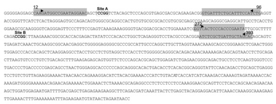 Long interspersed nuclear element 1 (LINE-1) promoter sequence. Recognition sites of MspI/HpaII isoschizomers are shown in bold; grey boxes and arrows indicate forward and reverse primers.