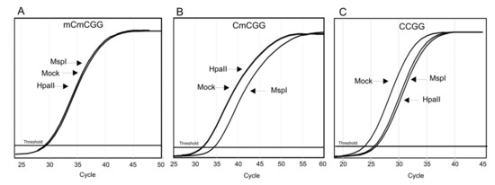 Both cytosines (CC) at the recognition site could be methylated, thus giving rise to different digestion patterns [33]. MspI cuts CCGG and CmCGG, but not when the external cytosine is methylated (mCCGG and mCmCGG), while HpaII cuts only unmethylated CCGG and, with a lower efficiency, mCCGG. These different cutting abilities gave rise to different amplification curves, since only undigested DNA was amplified (Figure 2).