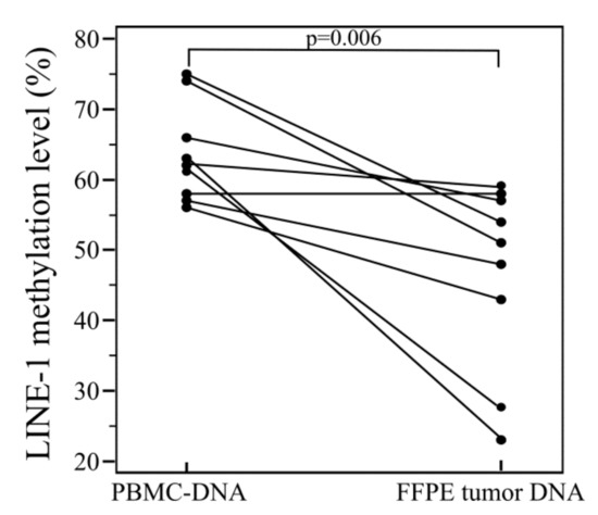 Using this approach, we were able to detect the presence of hypomethylated LINE-1 sequences in tumor FFPE-DNA. Furthermore, the difference between constitutive (i.e., PBMC-DNA) and tumor DNA was statistically significant (p = 0.006) (Figure 3).