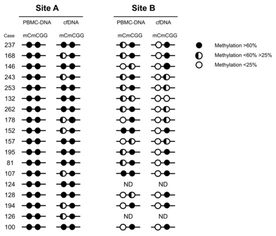 In Site B, the external cytosine residue, although partially demethylated in constitutive DNA, showed a very low residual methylation level, ranging from 6% to 24%, in cfDNA samples, with a median methylation level of 14% vs. 33% (p = 0.0024; Figure 5B). In contrast, no significant difference in methylation of the internal cytosine residue of site B was found between PBMC-DNA and cfDNA (Figure 4).
