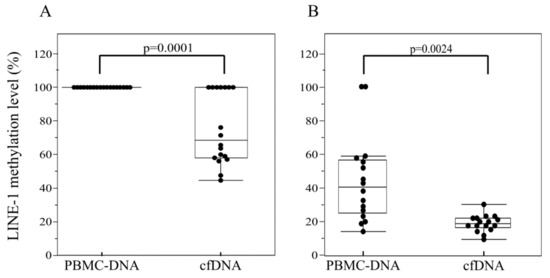 Dot plot of LINE-1 methylation level. Status of external cytosine of site A (A) and of site B (B) in PBMC and cfDNA.