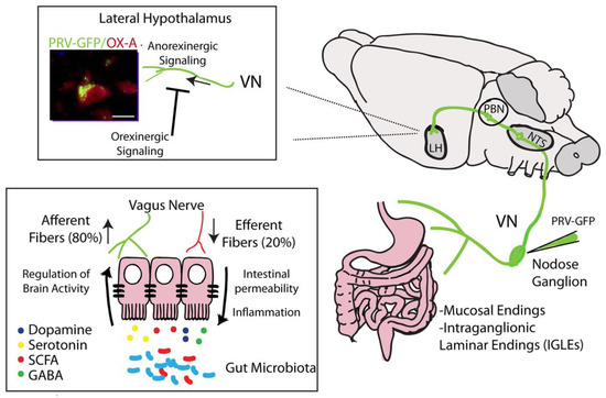 Identification of projections from the nodose ganglion to hypothalamic neurons (orexin/hypocretin neurons) by injection of pseudorabies virus (PRV)-GFP. Schematic representation of hypothalamic circuits, wherein the vagal nerve (VN) drives anorexinergic signaling. These circuits are, in turn, inhibited by hypothalamic orexigenic molecules (i.e., endocannabinoids). Right panel: Vagal afferences coming from the myenteric plexus and mucosal endings projecting to the nodose ganglia. At the supraspinal level, PRV-GFP labeling has been found in the nucleus tractus solitarius (NTS), parabranchial nucleous (PBN) and lateral hypothalamus (LH). Left panel: Co-localization of PRV-GFP labeling with Orexin-A (OX-A) immunoreactivity in the lateral hypothalamus (scale bar: 15 mm). Vagal efferent fibers regulate gut permeability and inflammation influencing gut functions; conversely, the gut microbiota affects brain activity via VN afferent fibers through the synthesis and secretion of molecules such as dopamine, serotonin, short-chain fatty acids (SCFAs) and γ-aminobutyric acid (GABA).