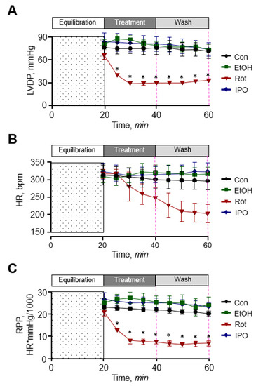 Cardiac function. (A) Left ventricular developed pressure (LVDP). (B) Heart rate (HR). (C) Rate pressure product (RPP). LVDP is the difference between left ventricular systolic pressure and left ventricular end-diastolic pressure. RPP was calculated as the product of LVDP and HR. Con, control; EtOH, ethanol; IPO, isopropanol; Rot, rotenone. * p < 0.05 vs. Con, n = 6–8.
