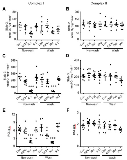 Mitochondrial respiration rates for electron transport chain (ETC) complexes I and II. State 2 (A,B), state 3 (C,D), and respiratory control index (RCI) (E,F) for complexes I and II. Mitochondrial respiration rates were measured in isolated mitochondria using substrates for complexes I (α-ketoglutarate and L-malate) and II (succinate) in the absence (state 2) or presence of ADP (state 3). Oxygen consumption rates are presented in nmol oxygen/min per mg of mitochondrial protein. RCI by Lardy was calculated as the ratio of state 3 to state 2. Con, control; EtOH, ethanol; IPO, isopropanol; Rot, rotenone. * p < 0.05, *** p < 0.001 vs. Con, n = 6–8 per group.
