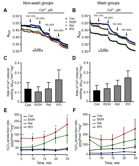 Mitochondrial swelling and reactive oxygen species (ROS) production rates. Representative curves (A,B) and quantitative data (C,D) of mitochondrial swelling, and the rates of mitochondrial ROS production rates (E,F). Mitochondrial swelling as a marker of permeability transition pore (PTP) opening was induced by addition of CaCl2, shown as the added and the final (cumulative) concentration in brackets, and measured by monitoring the decrease in light scattering at 525 nm. Quantitative data (C,D) are given for mitochondrial swelling rates induced by 200 µM Ca2+. Basal (no Ca2+) rates of mitochondrial ROS production (E,F) were measured for 25 min with 5-min intervals. Con, control; EtOH, ethanol; Iso, isopropanol; Rot, rotenone. * p < 0.05 Con vs. Rot, n = 6–8 per each group.