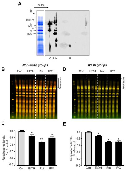 Respirasome levels in mitochondria isolated from non-wash and wash groups by blue-native polyacrylamide gel electrophoresis (BN-PAGE). (A) Representative two-dimensional BN-PAGE (2D BN-PAGE) of RCS. Mitochondria were treated with digitonin and subjected to 2D BN-PAGE. ETC complexes were visualized using antibodies against the subunits NDUFB8 (complex I), SDHB (complex II), UQCRC2 (complex III), MTCO1 (complex IV), and ATP5A (complex V). (B,D) Representative BN-PAGE images of RCS. (C,E) Quantitative data of RCS levels. The levels of respirasome were expressed as a percent change of control (Con). EtOH, ethanol; IPO, isopropanol; Rot, rotenone. * p < 0.05; ** p < 0.01 vs. Con, n = 3 per each group.