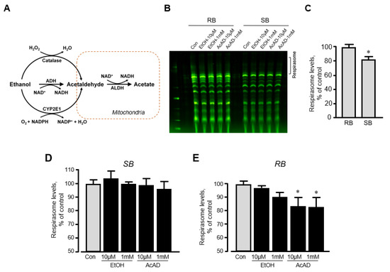 The effects of acetaldehyde (AcAD) and ethanol (EtOH) on the respirasome assembly in mitochondria in vitro. Mitochondria isolated from healthy (non-treated) rat hearts were diluted in either sucrose or respiration buffer and incubated with AcAD or EtOH for 60 min at 37 °C. At the end of the incubation period, RCS were analyzed by BN-PAGE. (A) Diagram of EtOH metabolism in the cell. (B) Representative images of RCS in mitochondria diluted in either sucrose or respiration buffer. (C) Respirasome levels in mitochondria diluted in either sucrose or respiration buffer. (D,E) The effects of AcAD and EtOH at high (1 mM) and low (10 µM) concentrations on respirasome levels in mitochondria diluted in either sucrose (D) or respiration buffer (E). Respirasome levels were presented as the percentage of control (Con). * p < 0.05 vs. Con, n = 3 per each group. RB: Respiration buffer, SB: Sucrose buffer.