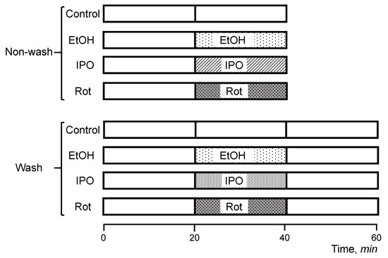 Scheme of experimental design. Rats were chosen randomly to participate in one of the following eight experimental groups: (1) control (no-treated group), 40-min perfusion (n = 6), (2) ethanol (EtOH) group, 20-min perfusion with EtOH (n = 8), (3) rotenone (Rot) group, 20-min perfusion with Rot (n = 8), (4) isopropanol (IPO) group, 20-min infusion with IPO (n = 6), (5) control (no-treated group), 60-min perfusion (n = 6), (6) EtOH-wash group, 20-min perfusion with EtOH followed by a 20-min perfusion without EtOH (n = 6), (7) Rot-wash group, 20-min perfusion with Rot followed by a 20-min perfusion without Rot (n = 6), and (8) IPO-wash group, 20-min perfusion with IPO followed by a 20-min perfusion without IPO (n = 6). Details are given in Materials and Methods.