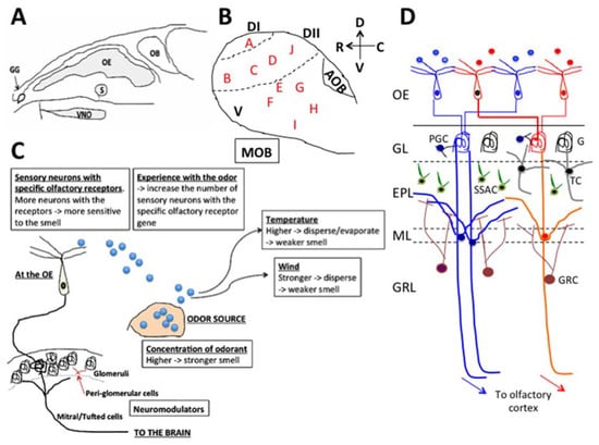The olfactory system. Locations of areas with sensory neurons in the nasal cavity of mice (A), the domains of the olfactory bulb with clusters of odor maps (B), a summary of the factors that affect the olfactory sense (C), and the pathway in the olfactory bulb (D). OB: olfactory bulb, OE: olfactory epithelium, GG: Grüneberg ganglion, S: septal organ, VNO: vomeronasal organ, GL: granular layer, EPL: external plexiform layer, ML: mitral cell layer, GRL: granule cell layer, PGC: peri-glomerular cell, G: glomerulus, TC: tufted cell, GRC: granule cell, SSAC: superficial short axon cell. The letters in red in (B) indicate the locations of Cluster A to J based on Mori et al. [28] and Mori and Sakano [29]. The D, V, R, C on the upper right side top in (B) beside the arrows mean dorsal, ventral, rostral, caudal, respectively.