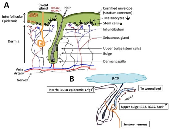 The morphology of skin (A) and a hypothetical model on the impact of β-caryophyllene on wound healing in mice (B). There are stem cell niches in the basal epidermis layer (shown as “Stem cells” in (A)) and in the upper bulge (shown as “Upper bulge (stem cells)” in (A)). Locations of human olfactory receptors OR2AT4, OR2AT4/7, OR51B5, and OR51E2 are indicated in red. The stem cells born at the basal epidermis layer differentiate into keratinocytes. The stem cells born at the upper bulge region of hair follicles differentiate into a new hair and do not participate in epidermal homeostasis [64]. When there is a cutaneous wound, the stem cells born at the upper bulge of hair follicles migrate to the basal epidermis stem cell region and convert to epidermal stem cells, and migrate to the wound bed (illustrated in (B)) [64]. BCP: β-caryophyllene.
