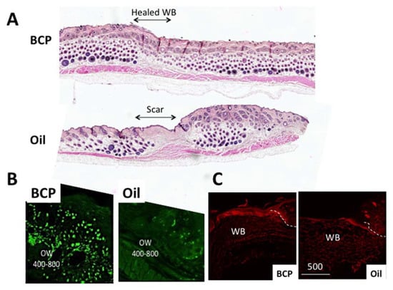 Skin exposed to β-caryophyllene or oil. (A) Six weeks after the application of β-caryophyllene for five days. The wound bed (WB) lacks scar formation compared to the clear scar in the oil group control. Hematoxylin and eosin (H&E) staining. (B) Cell proliferation (bromodeoxyuridine (BrdU)+ cells) (green) was higher in the dermis and epidermis of skin post-wound day 4 exposed to β-caryophyllene compared to the Oil group control. BrdU was injected twice, every two hours, and the skin was harvested four hours after the first injection. OW 400–800: out of wound bed, 400 to 800 um. (C) LGR5 (red) expression was stronger in the skin post-wound day 4 exposed to β-caryophyllene, compared to oil group control (from [2]). The dotted line indicates the wound edge. WB: wound bed.