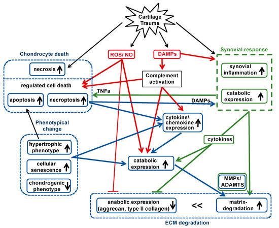 Cartilage trauma leads to oxidative stress and DAMP release. These mediators further trigger regulated chondrocyte death, synovial response and complement activation, which result in the production of catabolic enzymes and pro-inflammatory factors—key drivers of ECM degradation. These pathophysiologic conditions also promote phenotypical changes of the chondrocytes, comprising hypertrophy and senescence. Black lines = directly trauma-related; blue lines = chondrocytes-related; green lines = synovial cell-related; red lines = directly ROS/DAMP/complement-related.