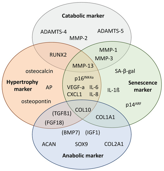 Besides hypertrophy, OA chondrocytes can also express a senescence-like phenotype, though the characteristics overlap with the hypertrophic phenotype to some extent. For instance, senescent cells exhibit a senescence-associated secretory phenotype (SASP), which shows great similarities to the hypertrophic markers (i.e., IL-6, IL-8, MMP-13 and VEGF-a) [146]. However, senescence-associated accumulation of β-galactosidase (SA-β-Gal) [147] as well as enhancement of cell cycle inhibitors p14ARF and p16INK4a are considered as exclusive biomarkers of cellular senescence, while latter has further been identified as important effector in senescence-related processes [148]. Senescent chondrocytes were also found to actively secrete ROS [149] and exhibited an increased expression of MMP-1/-3, IGFBP3, and IL-1β [150,151]. In articular cartilage, senescence might occur “naturally” in an age-depending manner [146,152] or can be induced by mechanically injury and subsequent oxidative stress [153]. In fact, accumulation of senescent chondrocytes has been frequently reported in context of PTOA [135,154]. Furthermore, IL-1β stimulation [155,156] as well as serum-exposition [109] have also been observed to enhance chondrocyte senescence in vitro. Interestingly, Philipot et al. observed enhanced expression of p16INK4a—but not p14ARF—during in vitro chondrogenesis of human MSC and found a significant reduction of the hypertrophic zone, including non-proliferating terminally differentiated chondrocytes, in ink4a knockout mice [156]. These findings provide evidence of a possible link between a senescence-like phenotype and chondrocyte hypertrophy. For further information about chondrocyte hypertrophy in OA, the authors would like to refer to the recent review of Ripmeester at al. [157]. Figure 3 illustrates a summarizing overview about catabolic, anabolic, hypertrophic and senescence-associated markers and the respective assignment.