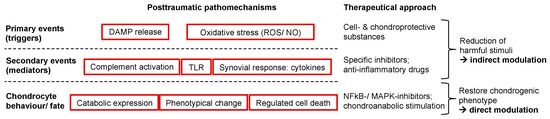 In general, there are diverse targets which need to be addressed after traumatic joint injuries. In our experience, attenuation of harmful mediators improves the overall situation and leads to cell- and chondroprotection (indirect modulation) [38,159]. However, the direct modulation of the surviving cells by chondroanabolic substances or inhibitors of detrimental pathways, responsible for catabolic enzyme and chemokine expression, is also possible.
