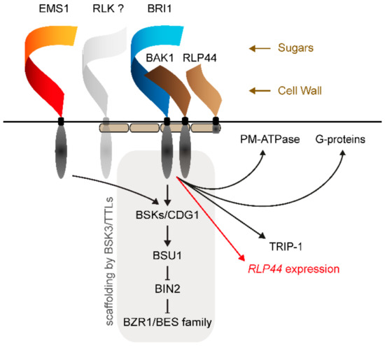 One of the primary outputs of BR signalling is altering cell wall properties to control elongation growth. This is reflected in the abundance of cell-wall-related BR target genes [58,148,149], but also in post-translational control of enzymes controlling extracellular pH [140] and cell wall biosynthesis [150]. In addition, BR signalling might exert control over cell wall properties through regulation of microtubule alignment as a determining factor of cellulose and therefore cell wall mechanical anisotropy [151,152]. However, the cell wall also feeds back on BR signalling [153]. The state of pectin, an important component of the plant cell wall and a dynamic regulator of its properties [154,155,156,157], is relayed to the BR receptor complex by RECEPTOR-LIKE PROTEIN44 (RLP44), which directly interacts with both BRI1 and BAK1, likely acting as a scaffold to promote their association [103,158,159]. In line with this notion, RLP44 is sufficient to promote BR signalling, at least partially independent of BRs [103].