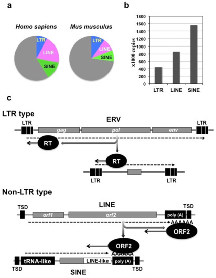 The mammalian genome contains two major classes of mobile genetic elements, and retrotransposons fall into the class 1 category [2]. Class 2 mobile genetic elements represent DNA transposons, which travel in the host genome by cutting and pasting themselves. Although the human genome contains 294,000 copies of DNA transposon-associated elements, they are no longer active and are regarded as genetic fossils [2]. In contrast, class 1 mobile genetic elements include a number of active retrotransposons that are able to modify our genome structure. These retrotransposons are classified into two major groups; one is long terminal repeat (LTR) type, and the other is non-LTR type [2,5]. Both groups contain autonomous retrotransposons that can copy and paste themselves using their own devices, and non-autonomous retrotransposons that can replicate only under the assistance of the autonomous ones. The autonomous non-LTR retrotransposons are represented by long interspersed nuclear elements (LINEs), whereas the non-autonomous ones are called short interspersed elements (SINEs). Among mammalian species, the human genome is particularly characterized by the involvement of a vast number of retrotransposons (Figure 1a). Indeed, more than 40% of the human genome is occupied by these mobile genetic elements, in which the LINE territory is the largest. In contrast, their occupancy in the murine genome is approximately 27%. This discrepancy suggests a critical role of these elements during the course of human evolution [2]. Regarding the copy number in the human genome, SINE stands out, represented by the Alu family that was actually regarded as a hallmark of the human genome (Figure 1b) [7].