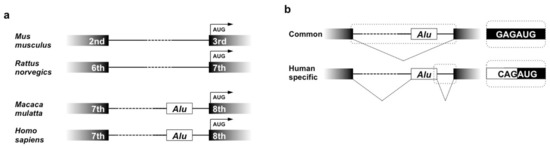 Alu integration into ZBTB38 occurred before the evolution of Hominidae, since it is already present at this particular locus in the genomes of the rhesus macaque (Macaca malatta) and the common marmoset (Calithrix jacchus) [27]. Although ZBT38 gene is conserved, the gene structure is different between primates and rodents (Figure 5a). The open reading frame starts from the 3rd and 7th exons of mouse and rat CIBZ genes, respectively, whereas primate ZBTB38 protein is encoded after the 8th exon. In the intron immediately upstream of the 8th one, an Alu copy is integrated. As such, the location of the Alu element in ZBTB38 is identical among primates. However, interestingly, these Alu elements behave differently, depending upon species. In the rhesus macaque and the common marmoset, splicing of ZBTB38 pre-mRNA is conducted as if the Alu element is not present, eliminating this element as a part of the intron. In contrast, in human cells, an alternative acceptor in the Alu element accepts the authentic donor of the 7th exon. The same Alu element also provides an alternative donor for the acceptor of the 8th exon. Consequently, the majority of the Alu sequence is added as an extra exon of 123 bases between exons 7 and 8 in the mRNA variant (Figure 5b) [27]. Since the Alu-derived new exon is located upstream of the translation initiation codon, it does not affect the primary structure of ZBTB38 protein. Instead, addition of this exon may alter the translation efficacy of mRNA by changing the proximity of the nucleotide sequence around the translation initiation codon to the Kozak’s consensus. It needs to be noted that the authentic mRNA with properly connected exons 7 and 8, as well as the Alu-containing one, is expressed in a variety of normal human cells. The impact of the Alu exonization on chondrocyte biology and skeletal development still remains unclear; however, the human-specific behavior of the Alu element implies a novel epigenetic mechanism of retrotransposon regulation in human cells and the human-specific role of such Alu elements.
