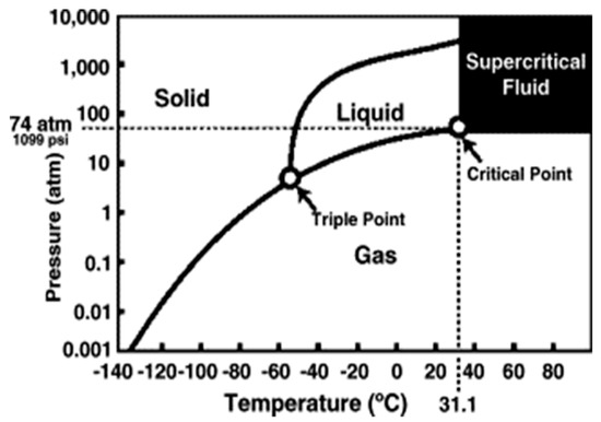 Phase diagram of CO2 showing the critical point at 31.1 °C and 1099 psi [54].