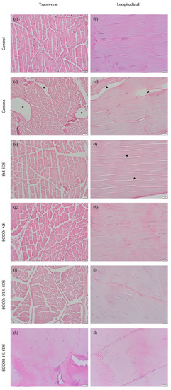Representative high-resolution histological images of transverse and longitudinal sections. In haematoxylin and eosin (H&E) sections, collagen was stained pale pink with interspersed dark blue nuclei conspicuous in all groups except the standard SDS group. The histological dead space in the transverse sections are indicated with *. Separation of collagen bundles are indicated with black arrowheads. Scale bar at the bottom right represents 20 μm.