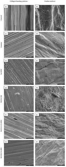 Under approximately 10,000× magnification, the surfaces of SCCO2-NK-, SCCO2-0.1%-SDS-, and SCCO2-1%-SDS-treated tendons (images h, j and l, respectively, Figure 3) resembled that of the native tendons (image b, Figure 3), whereas gamma-irradiated and standard-SDS-treated tendons (images d and f, respectively, Figure 3) exhibited numerous fissures on their surface, exposing the collagen fibers underneath.
