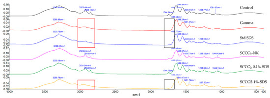 Representative FTIR spectra of the control, gamma-irradiated, standard-SDS-treated, SCCO2-NK-treated, SCCO2-0.1%-SDS-treated, and SCCO2-1%-SDS-treated tendons. The red and black boxes highlight the reductions of absorption peaks associated with CH2 and carbonyl groups, respectively.