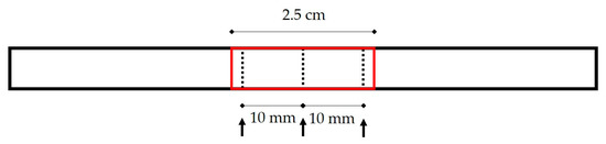 The locations of width and thickness measurements. The bold black frame represents a full-length tendon. The central mid-substance encircled in the red frame was designated as the gauge length for mechanical testing. The dashed lines pointed by black arrows delineate where the width and thickness measurements were taken.