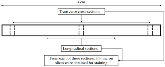 Sample preparation for histology. The bold frame represents a 4-cm tendon segment and dash lines indicate where cuts were made with a scalpel to 3 transverse and 2 longitudinal sections. From each of these sections, 5-micron slices were acquired for staining with haematoxylin and eosin (H&E). Two 40× magnification images were taken for each cross-section, culminating in 18 images per group as there were 3 transverse cross-sections per tendon segment, and 3 tendon segment per group.