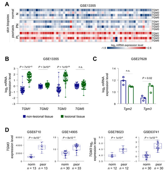 2.1. Both TGM1 and TGM3 Are Upregulated in Skin from Patients with Psoriasis
