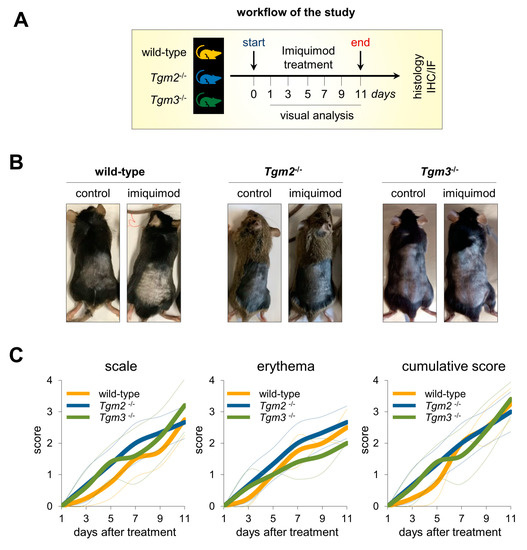 Although TG1, TG2, TG3, and TG5 play pivotal roles both in skin barrier structure and/or inflammatory processes, the contribution of their activities as causes and effects of psoriatic disease remains elusive. Topical application of imiquimod, a ligand of TLR7 and TLR8, induces a psoriasis-like skin inflammation with typical microscopic and macroscopic psoriatic markers in mice, and is the most commonly used psoriasis animal model [38].