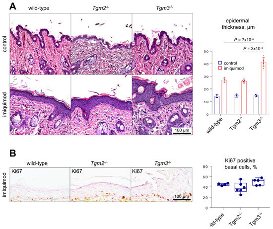 Thus, imiquimod-treated mice presented apparent dysregulated hyperproliferation of keratinocytes compared to that of the controls in each group. Hyperproliferation of basal keratinocytes was also monitored by Ki67 immunohistochemical analysis. Ki67 is a cell proliferation marker, and in imiquimod-treated mice, Ki67 staining was slightly increased in the basal epidermal layer of TG3-KO mice compared to that of wild-type and TG2-KO mice, although the difference was not statistically significant (Figure 3B).