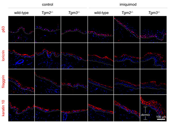 To evaluate the contribution of the different epidermal layers to the thickened epidermis observed in psoriatic TG3KO mouse skin, we performed immunofluorescence analysis of four epidermal differentiation markers, namely, p63, loricrin, filaggrin, and keratin 10, in the skin of controls and imiquimod-treated WT, TG2KO, and TG3KO mice. As shown in Figure 4, p63 protein, a marker of the proliferative compartment, was detected in the basal layers of all sections, while the two keratinocyte late differentiation markers filaggrin and loricrin were detected in the granular and upper granular compartments, respectively. In particular, we observed a more diffuse and disorganized distribution of loricrin in the psoriatic epidermis of TG3KO mice than in all other sections, probably due to a lack of TG3 crosslinking activity and to the consequent aberrant epidermal structure in these mice. Interestingly, imiquimod treatment led to a considerable thickening of the spinous layer in all of the treated mice, especially in TG3KO mice, as evidenced by the fluorescence labelling of keratin 10, a marker of the epidermal spinous layer. This observed hyperkeratosis might be the result of an increased permeability and sensitivity of TG3KO mouse skin to the psoriasis-inducing drug.