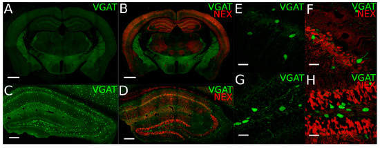 - Wang, Y.; Kakizaki, T.; Sakagami, H.; Saito, K.; Ebihara, S.; Kato, M.; Hirabayashi, M.; Saito, Y.; Furuya, N.; Yanagawa, Y. Fluorescent labeling of both GABAergic and glycinergic neurons in vesicular GABA transporter (VGAT)–Venus transgenic mouse. Neuroscience 2009, 164, 1031–1043. [Google Scholar] [CrossRef]