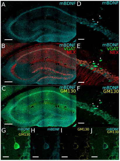 Expression of the mature form of brain-derived neurotrophic factor (mBDNF) in hippocampal glutamatergic and GABAergic neurons. (A–C) Immunostaining for mBDNF (cyan pseudocolor; A,B) and the Golgi marker, GM130 (yellow; C) in the dorsal hippocampus of VGAT-YFP x NexCre-Ai9 transgenic mice. (D–F) High-power confocal images from hippocampal CA1 area immunolabeled for mBDNF (D,E) and GM130 (F). Arrowheads indicate a cluster of YFP-positive GABAergic interneurons (INs; green), which are also labeled for mBDNF (D–F). (G–J) High-power confocal images from a hippocampal YFP-positive IN immunolabeled for mBDNF (G,H) and GM130 (I,J) (cyan and yellow, respectively) in the CA1 area from VGAT-YFP x NexCre-Ai9 transgenic mice (YFP signal in green). Note that the mBDNF signal is distributed throughout the somatic cytoplasm (H) and shows a partial colocalization with GM130 (J). Scale bars: (A–C), 200 µm; (D–F), 30 µm; (G–J), 10 µm.
