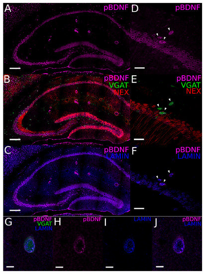 In the present study, we showed that proBDNF protein, a precursor of the mature form of BDNF, is present in the two main hippocampal neuron populations, glutamatergic neurons and GABAergic INs. Moreover, the immunolabeling for proBDNF highly overlapped with that of lamin, a marker of the nuclear envelope and ER perinuclear cisternae, the area where protein synthesis takes place. We take these results as a strong indicator that proBDNF could be synthesized in both of these neuronal groups.