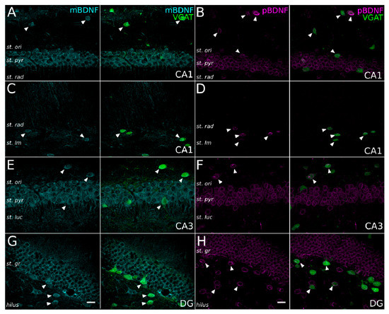To better understand how proBDNF and mBDNF expression colocalizes with GABAergic neurons, we performed a comparison of proBDNF and mBDNF immunostaining across cell body layers (CA1, CA3 and DG) of the hippocampus (Figure 4). We found that proBDNF was largely perinuclear and localized mainly in somatic regions (Figure 4B,D,F,H), while mBDNF was distributed throughout the whole cell, as expected (Figure 4A,E,G). Despite this difference, both the proteins showed a very strong and consistent localization not only to principal cells, but also to GABAergic neurons, throughout the hippocampus.