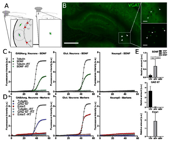 To minimize RNA degradation, we avoided histochemical or immunocytochemical procedures and took advantage of the endogenous YFP and RFP signals found in GABAergic and glutamatergic neurons, respectively (Figure 5B). To ensure reliable dissection of single cells, we prepared 10 µm coronal hippocampal cryosections, thus minimizing the chance of cell stacking. YFP+ and RFP+ cell bodies were visually identified before LCM. Individual cells were extracted by adhering them to a sterile cap, avoiding the collection of neighboring tissue (Figure 5B, insets). We separately collected cellular/neuronal and neurite/neuropil fractions from different hippocampal layers. For each repetition, the collected samples of fractions included: (1) somata from ~20 GABAergic cells from stratum oriens and stratum radiatum of CA1 and CA3 regions, (2) somata from ~20 PCs from CA1 and CA3 stratum pyramidale, (3) somata from ~20 granule cells from the cell body layer of the DG and (4) cell-body free neuropil tissue from stratum radiatum of CA1 and CA3 in a form and quantity similar to the cell-containing fractions. The last sample was used as a negative control, in which the expression of genes examined in this study was generally unexpected, with the exception of glial genes. The isolation efficiency was high for all samples (Figure 5B). No other tissue was removed from the hippocampal section and the remaining tissue remained intact following the capture procedure (Figure 5B). Collected LCM samples from six transgenic animals were processed immediately for single-cell RNA isolation and reverse transcription (RT) into cDNA. cDNA from the samples was used to detect BDNF mRNA using the qPCR technique. We chose a set of PCR primers specific to exon IX BDNF, which detects BDNF in any of its known isoforms. To distinguish between GABAergic and glutamatergic neurons, we applied primers specific to genes selectively expressed by these two main neuronal groups: (1) Emx1, exclusively expressed in cortical glutamatergic neurons and (2) GAD67, the GABA synthesizing enzyme in INs, which, however, is also expressed at low levels in hippocampal pyramidal and granule cells. Since Emx1 is not expressed by GABAergic neurons [35,36], we were able to estimate the purity of our IN samples. Additionally, glial fibrillary acidic protein (GFAP) primers were used as astrocyte markers. As a reference, we used the neuronal housekeeping gene: class III β-tubulin.